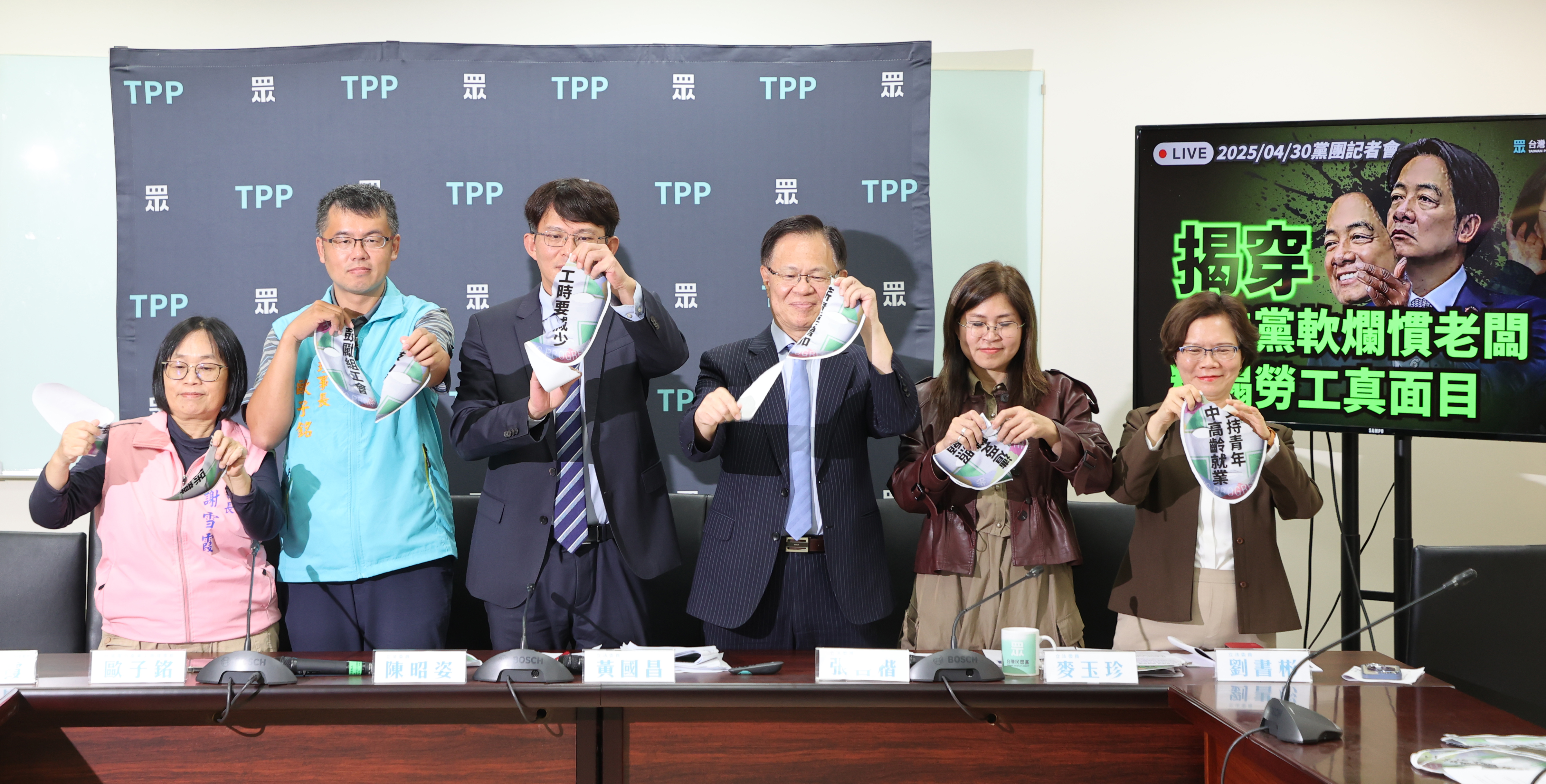 民眾黨立法院黨團上午舉行「揭穿民進黨軟爛慣老闆,糟蹋勞工真面目」記者會,與會者