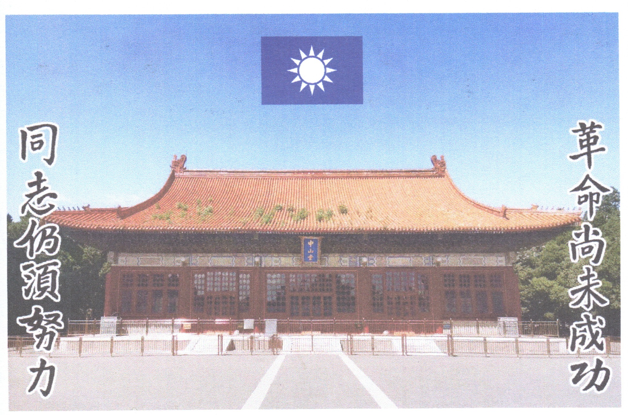山紀念堂,圖案兩旁印有「革命尚未成功,同志仍須努力」,另一面除了中山紀念堂的郵