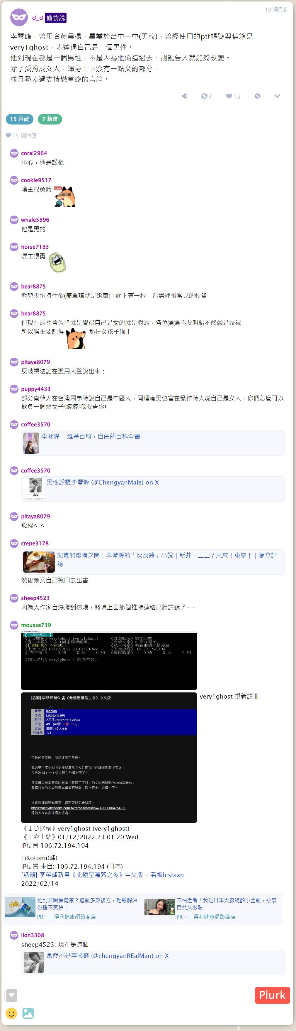 → color3258: 李琴峰 兩隻PTT帳號 very1ghost 118.167.72.133 06/07 11:56