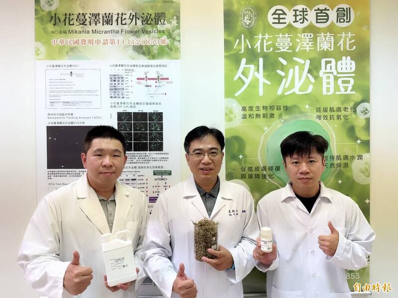 前美和科技大學副校長吳裕仁(中)與研發團隊萃取出小花蔓澤蘭花外泌體,為全球首個