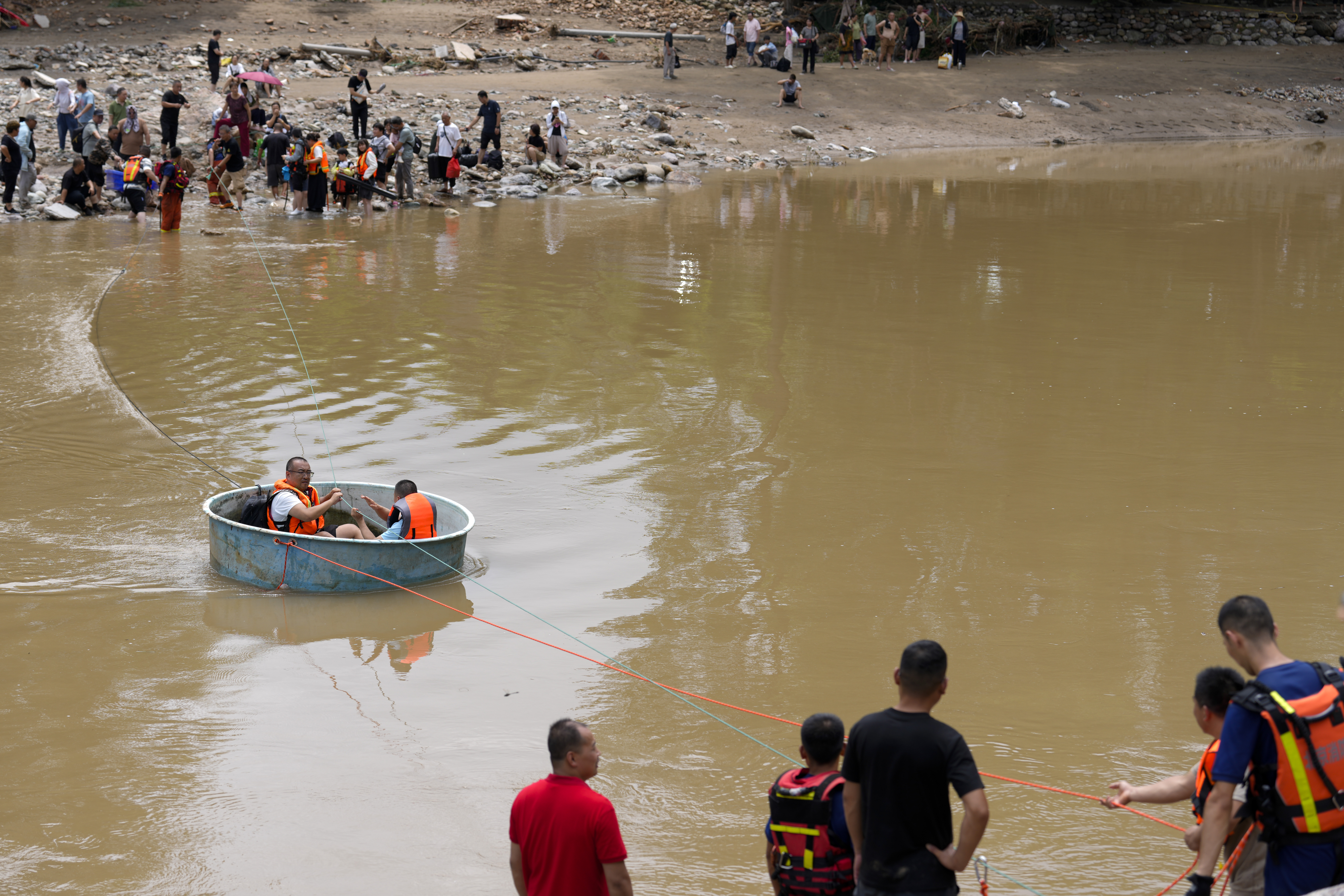 村,受災民眾乘坐塑膠大盆轉移到安全地點。中新社