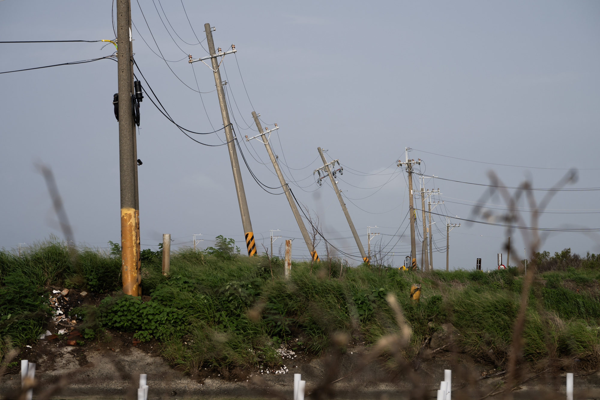 2025年7月31日,台南市七股區一處傾斜的電線桿。(攝影/楊子磊)