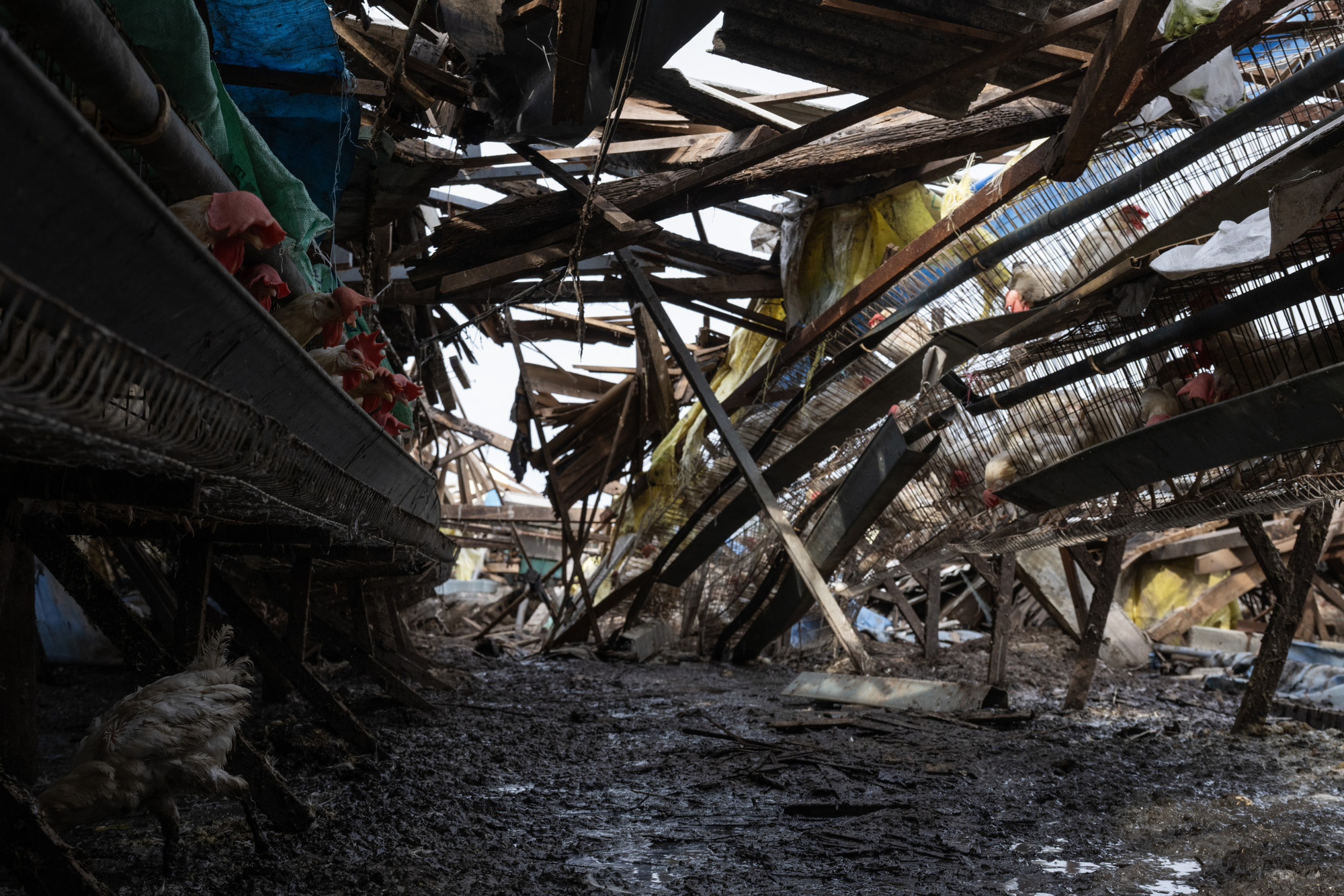 台南市七股區一處遭颱風吹倒的雞舍。風災月餘,養雞場主人與數千雞隻生活在遍布廢建