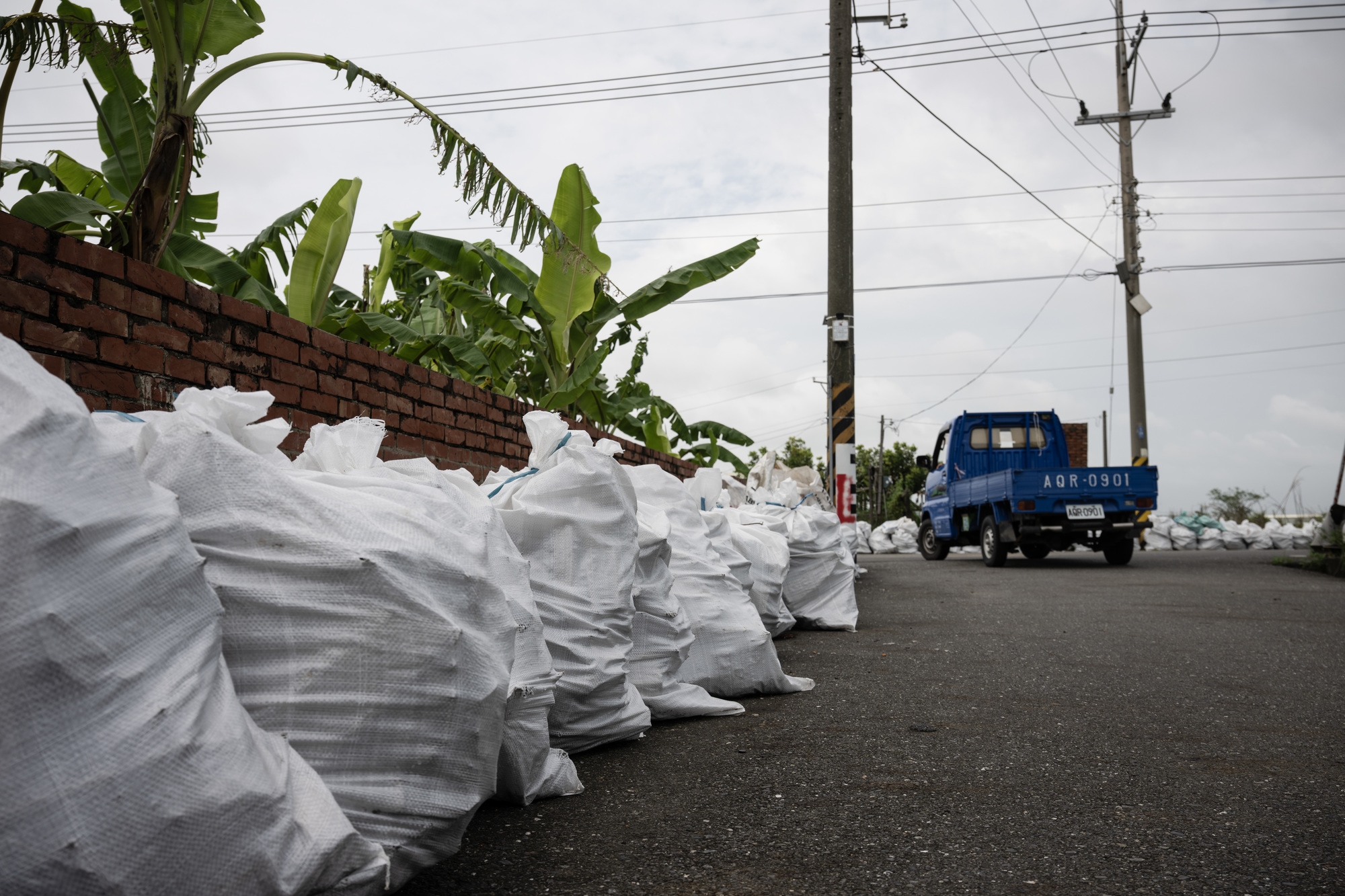 2025年7月30日,佳里後港腳聚落中仍有大量石綿瓦被裝袋後堆置於路旁。(攝影/楊子