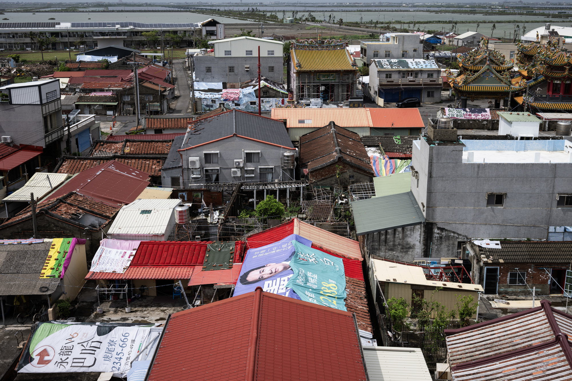2025年7月31日,從高處遠望,丹娜絲風災讓七股區頂山里多戶民宅開了天窗,五顏六色