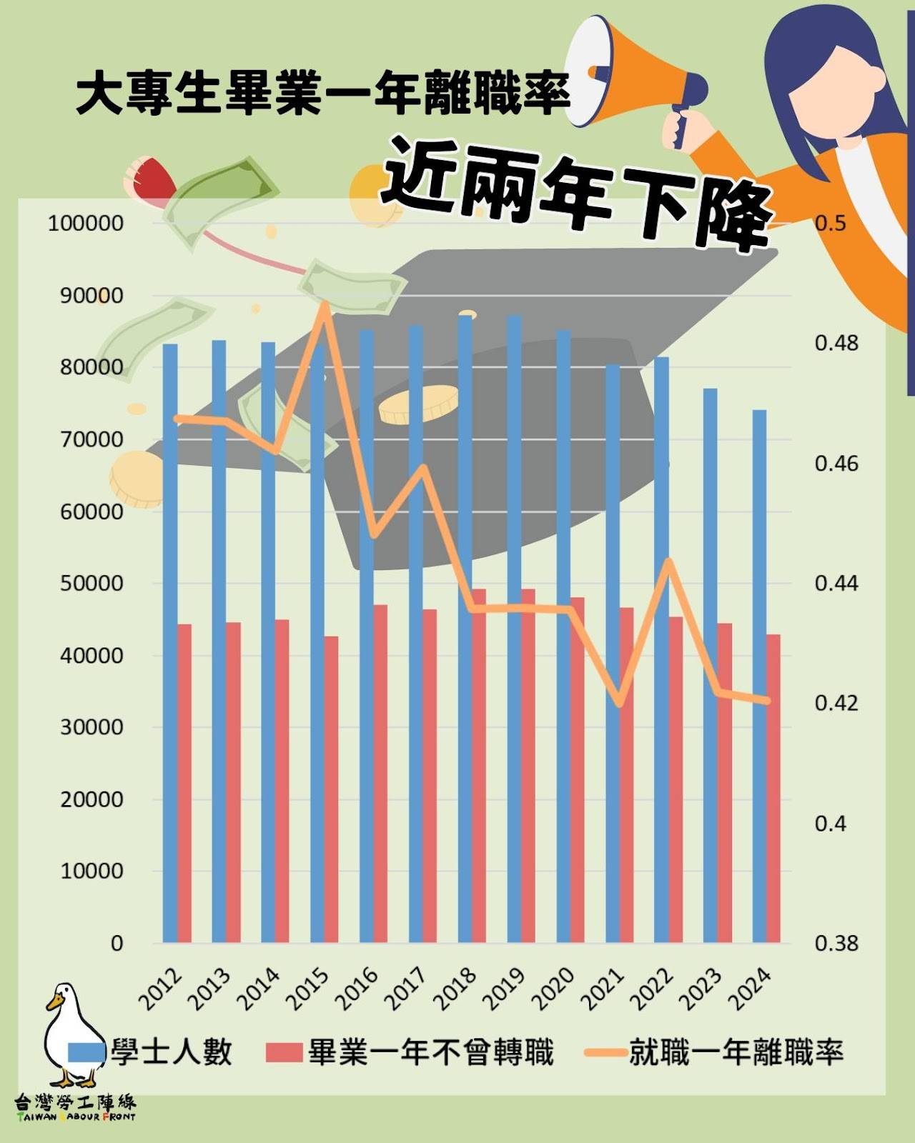 台灣勞動陣線調查發現,全台大專畢業職場新鮮人的「1年內離職率」,近兩年出現下降