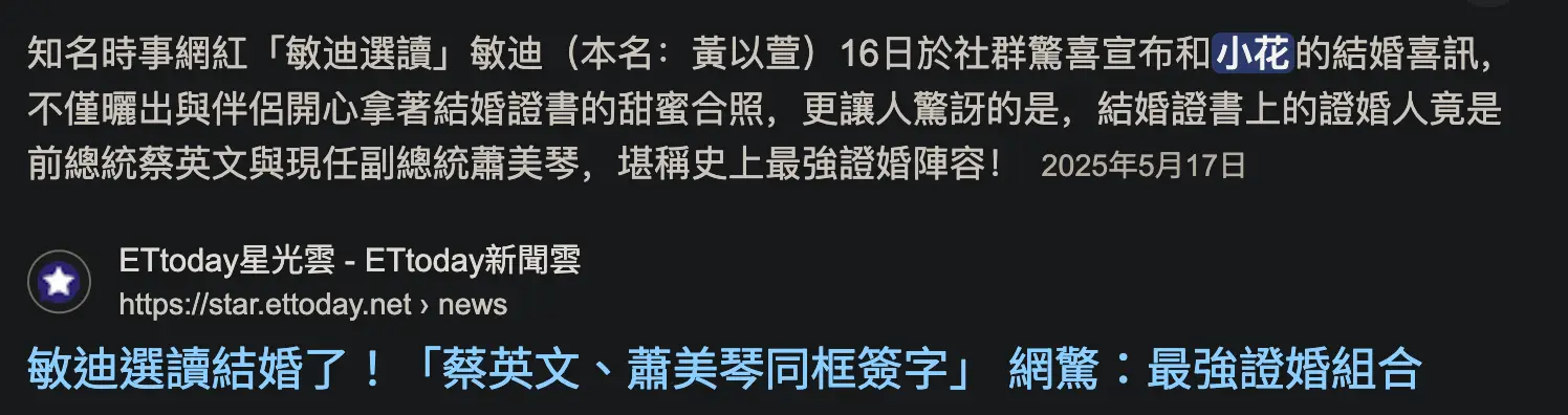 → Sanish: 訪問過賴清德,記得結婚還是蔡英文 蕭美 39.9.226.136 08/28 11:50