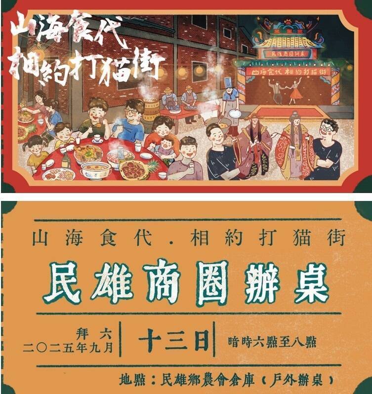 嘉義縣民雄大士爺祭於昨起連三天登場,民雄商圈也一同在民族路與文化路口舉辦「民雄下街文化祭-市集嘉年華」,今晚更以「山海食代,相約打貓街」為主題在民雄農會倉庫進行「民雄商圈辦桌」活動,結合經典酒家菜色、在地品牌贊助與藝術文化演出,預計吸引超過300名民眾參與,線上曝光突破10萬人。