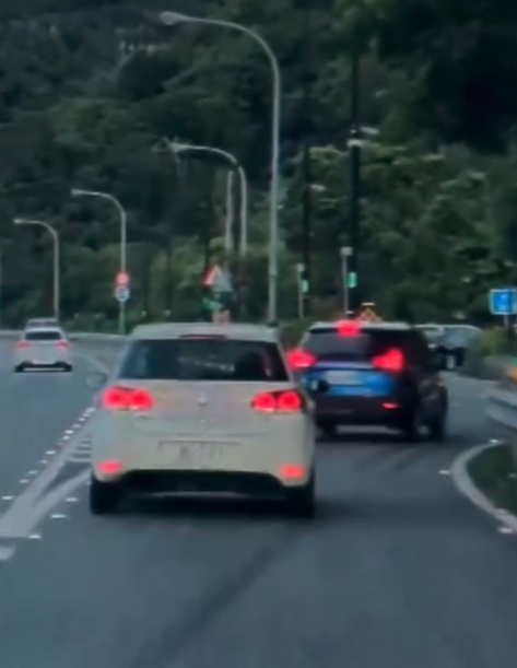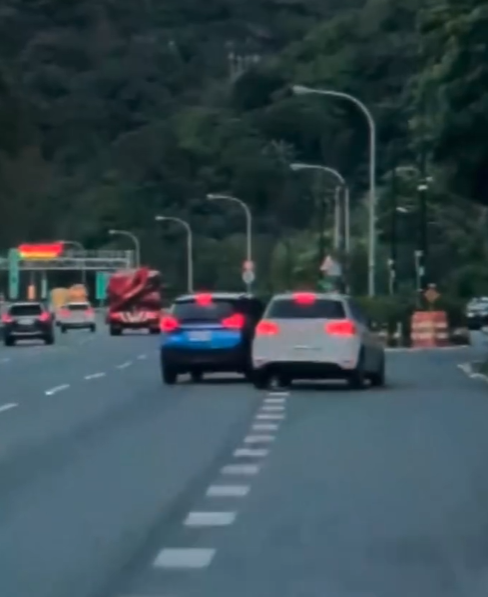 打 燈直接鬼切逼車,導致另輛白車急閃,最後被迫進入休息站,誇張一幕全被後方駕駛