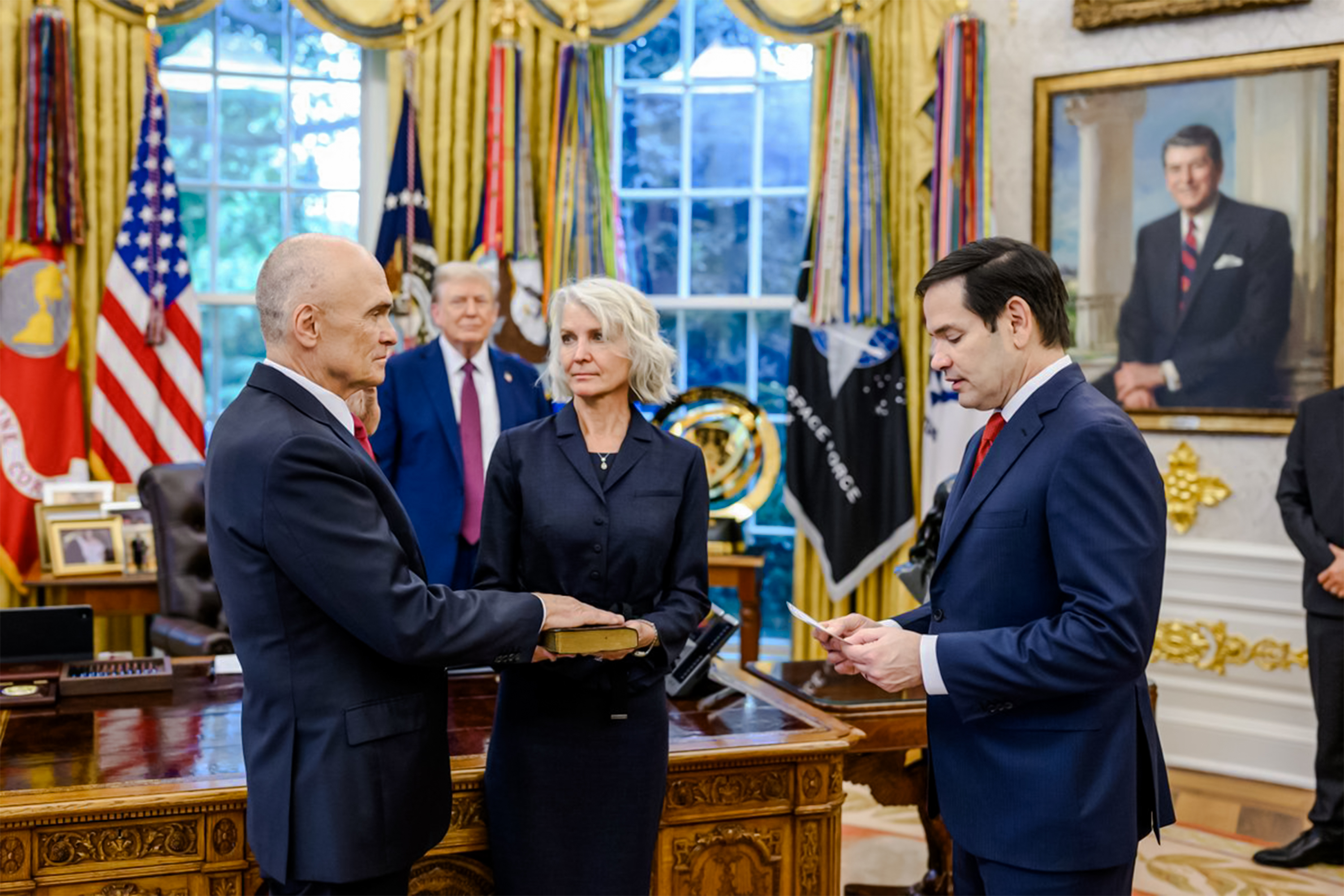 盧比奧(Marco Rubio)和總統川普的見證下宣誓就任美國駐歐盟大使。(White House)