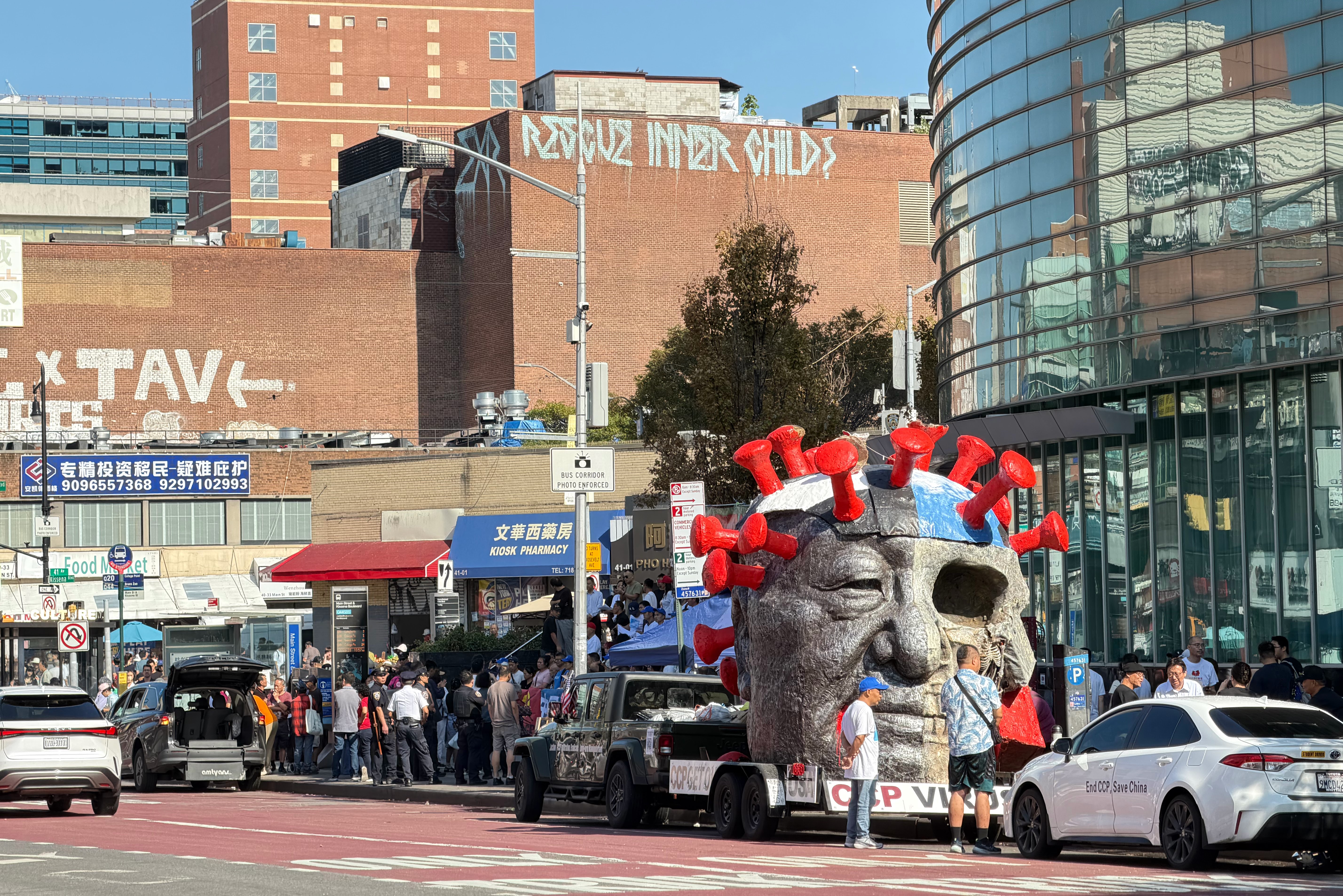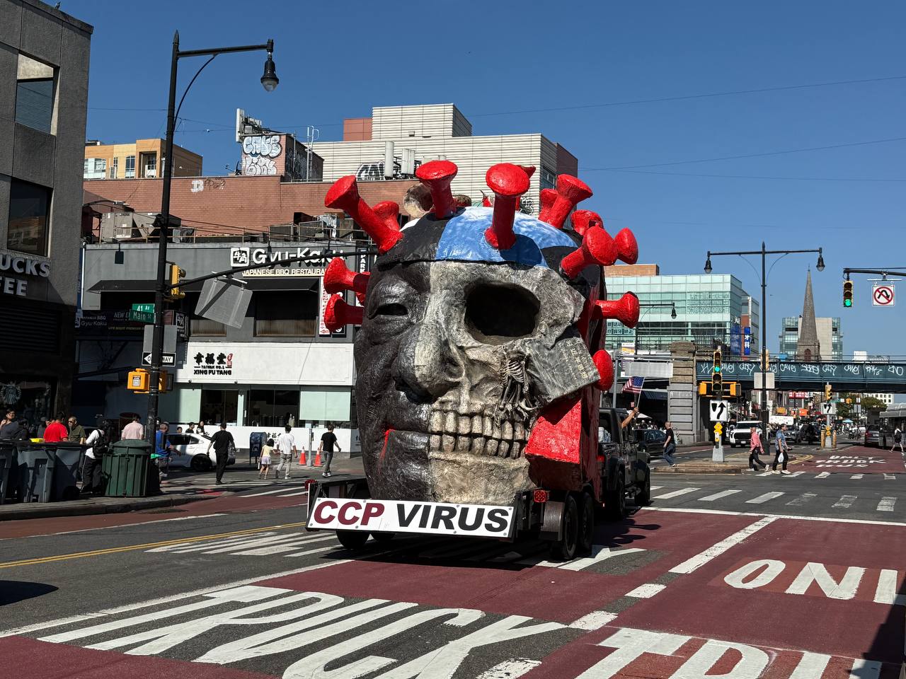 中共病毒雕塑車從加州來到紐約,9月28日在法拉盛街頭展示,提醒人們,全球中共病毒