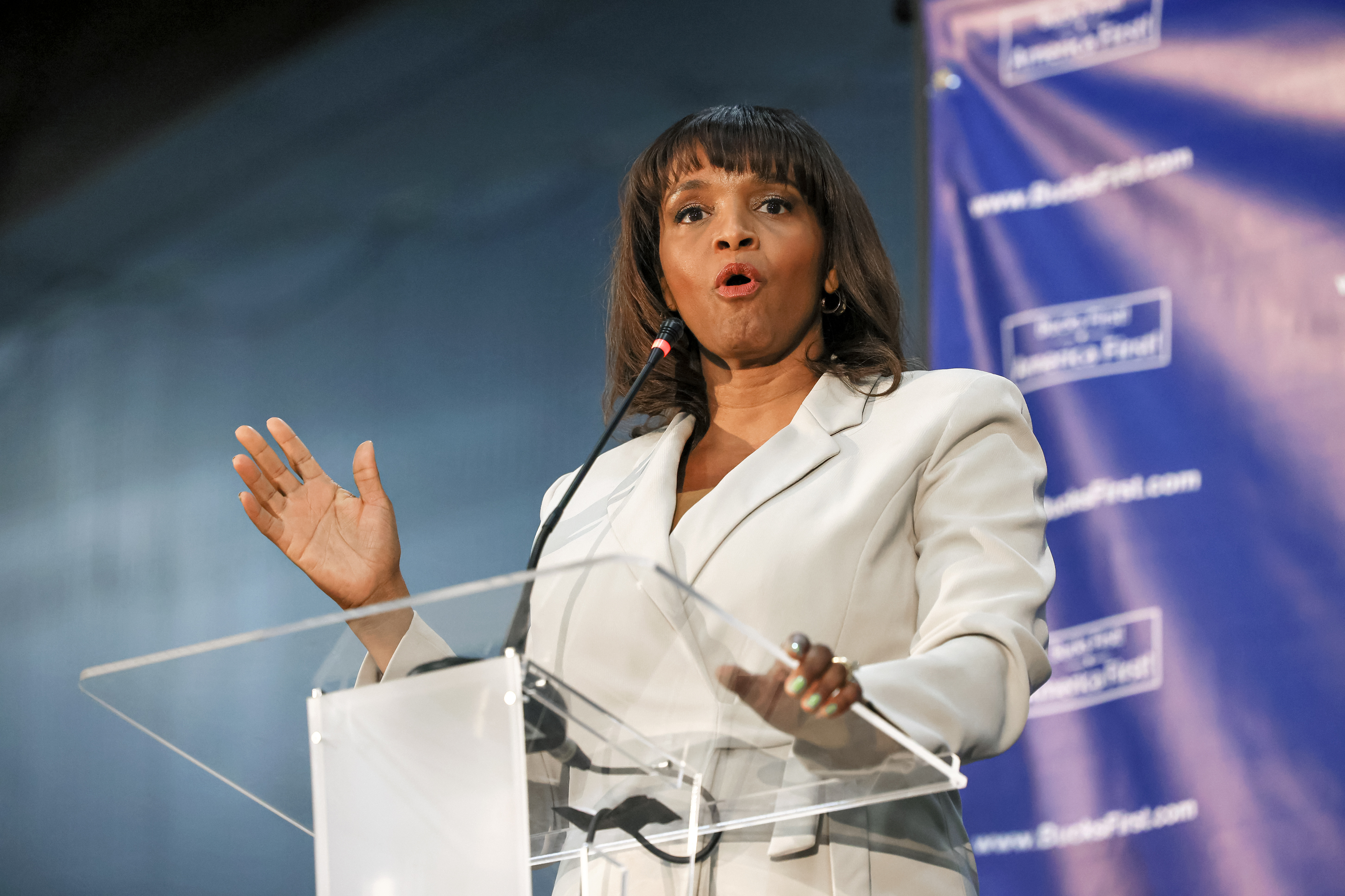 共和黨候選人凱西‧巴內特(Kathy Barnette)在此舉行的共和黨領導力論壇上發表講話