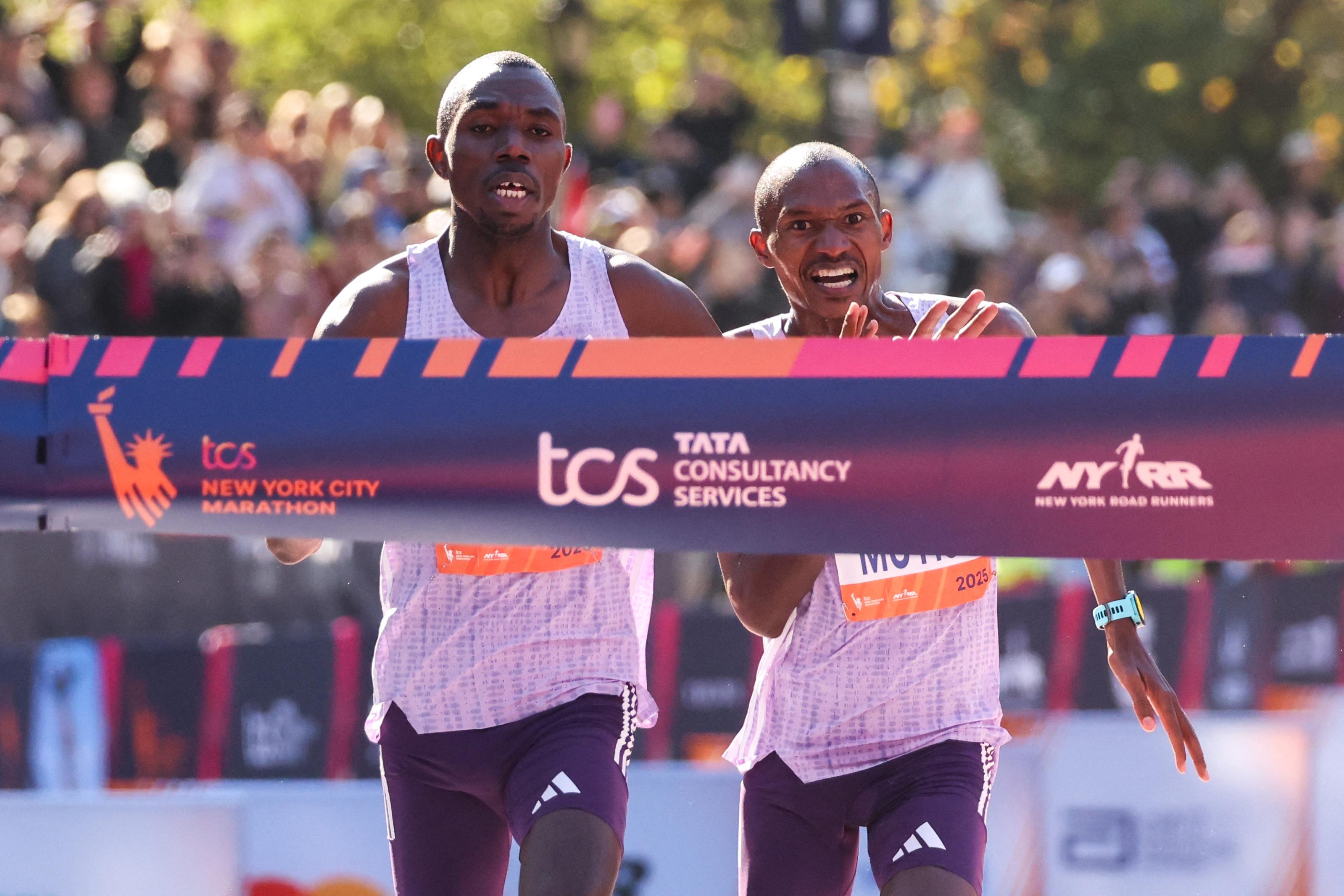 2025年紐約馬拉松於11月2日在紐約舉行。圖為僅差0.03秒的男子比賽前兩名。(Charly