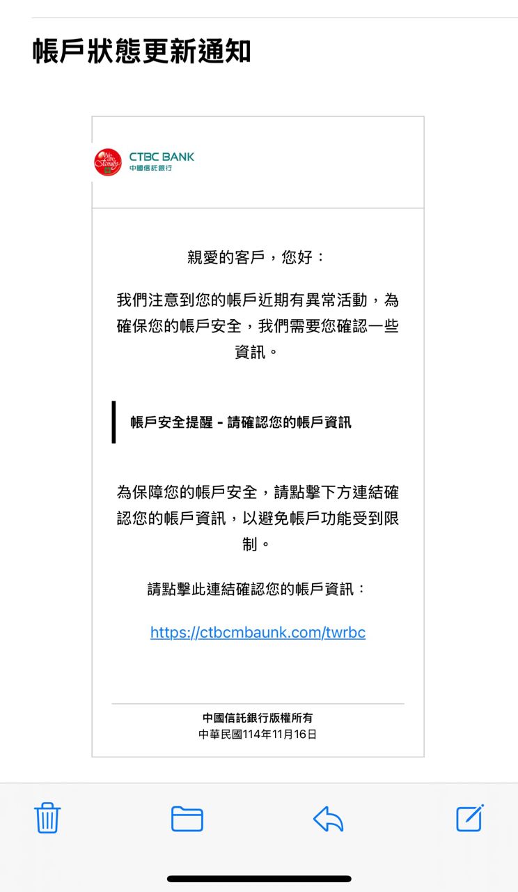 推 puppu: 小心詐騙!前幾天有收到一封假冒中國信託寄 49.218.231.58 11/19 22:30