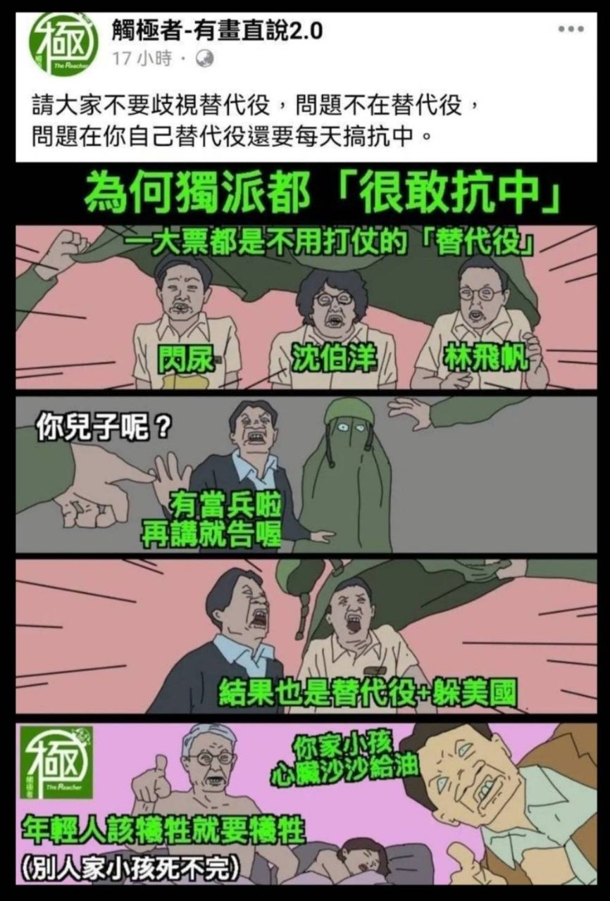 推 coffee112: 閃兵閃尿逃兵替代役又主戰是什麼派??218.164.143.42 12/09 20:21