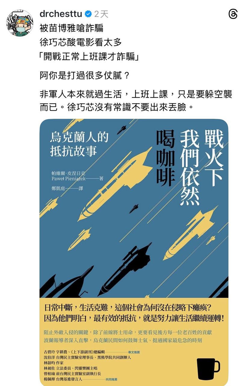 噓 rossikao: 笑死 鼻屎國家真打仗你他媽喝個姬芭咖啡 163.16.118.4 12/12 13:30