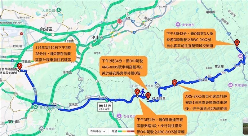 某處,再轉搭游致暐所駕駛的銀色轎車前往宜蘭,於頭城交流道下匝道,鍾文智於隔天(