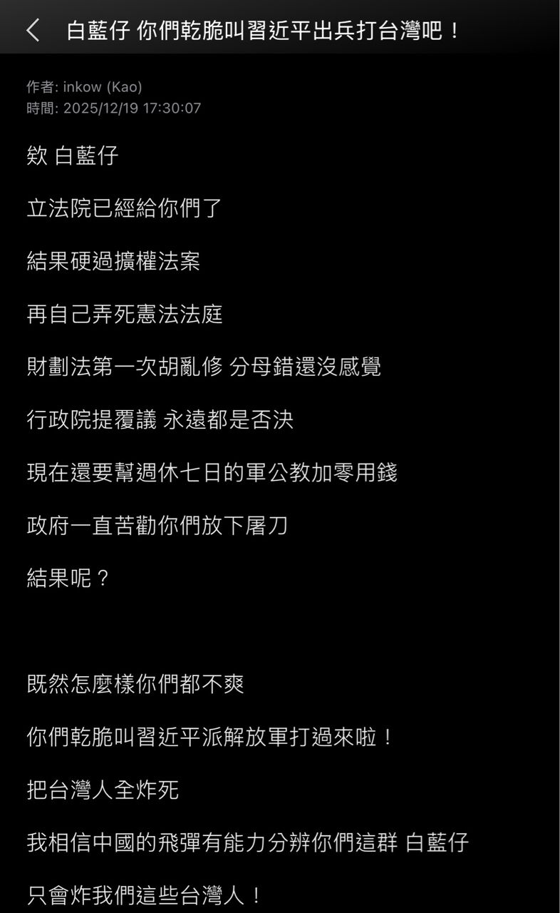 噓 AxelGod: 先抓賴清德 八囧閩南狼沈伯洋 再來談 118.233.3.56 12/19 22:48