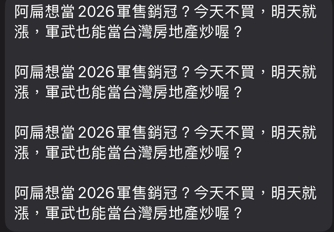 → pttuser0280: 買不到不就證明美國沒有要防衛台灣 36.229.158.49 01/01 10:22