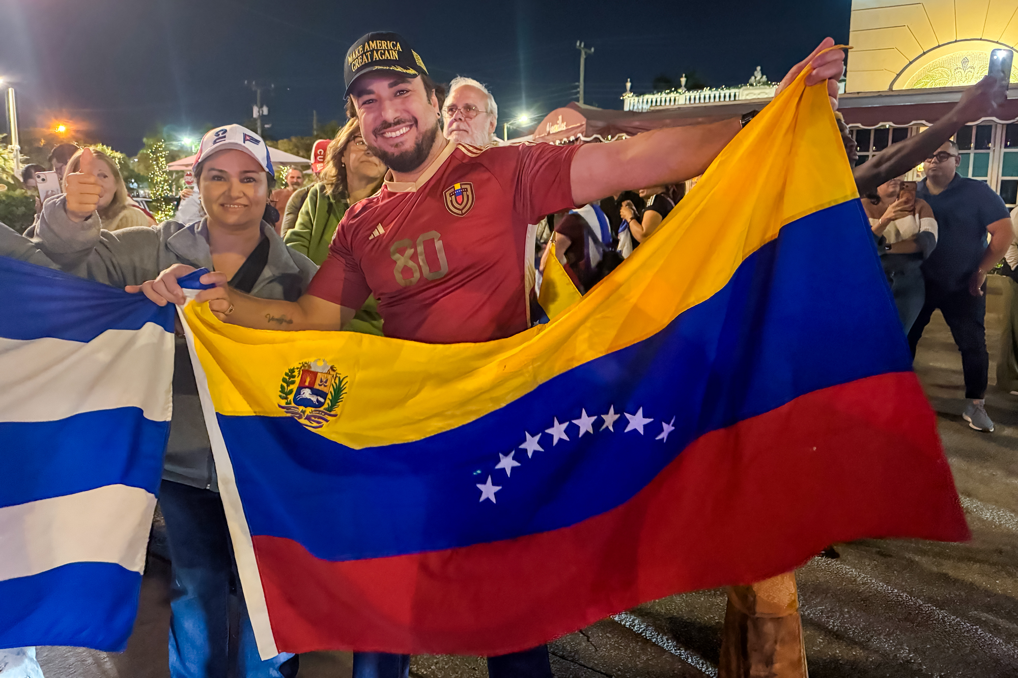 示歡呼。馬杜羅夫婦已被帶到紐約市,面臨包括毒品恐怖主義在內的聯邦指控。