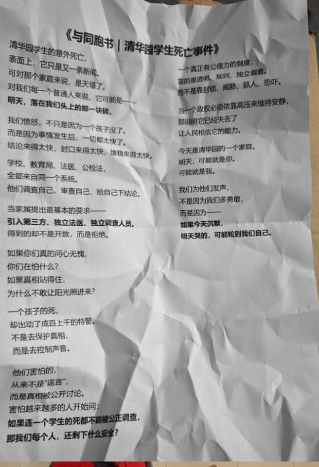 新蔡縣「今是清華園高級中學」中學生離奇死亡,家長維權遭鎮壓,網傳「與同胞書」。