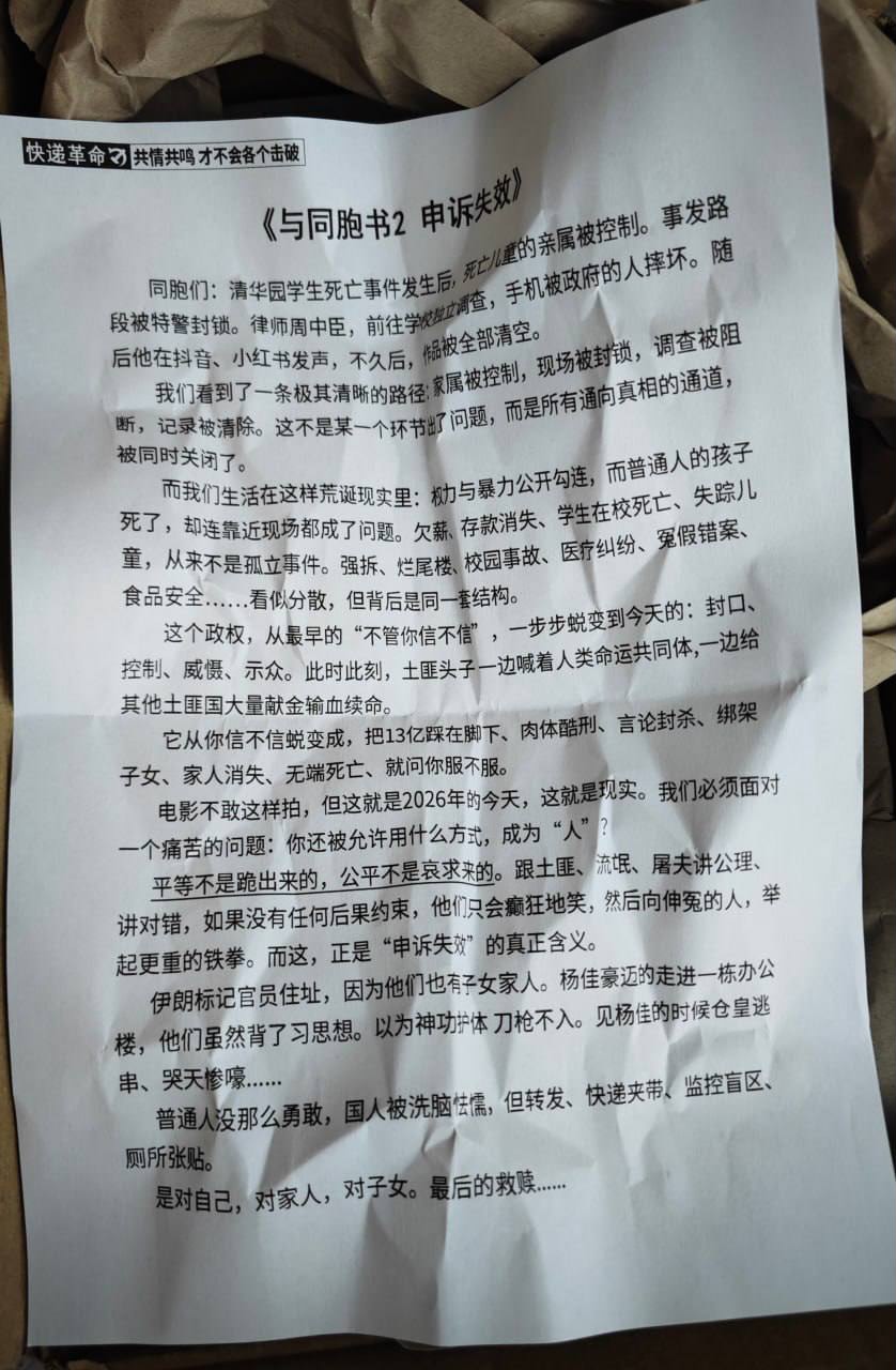 1月12日,中國大陸傳出兩份《與同胞書》,呼籲民眾覺醒,站出來反抗中共暴政。