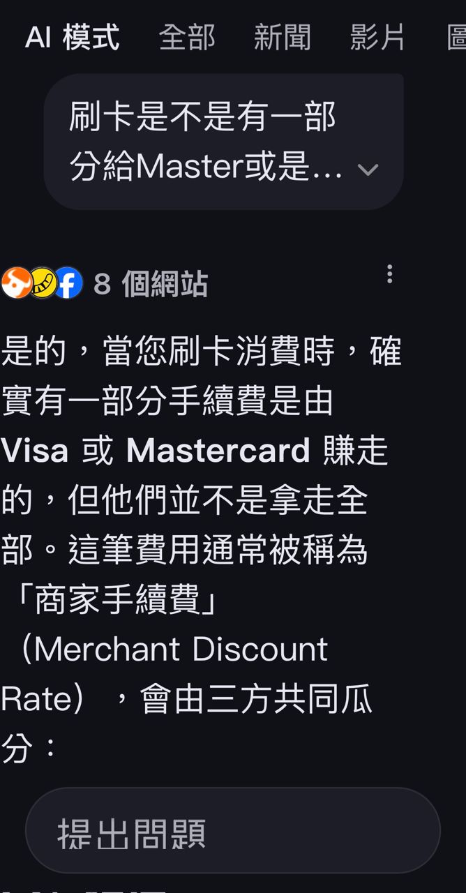 推 henry9: 刷卡確實是有一部份給Visa, MasterCard賺 14.191.68.116 01/27 10:58