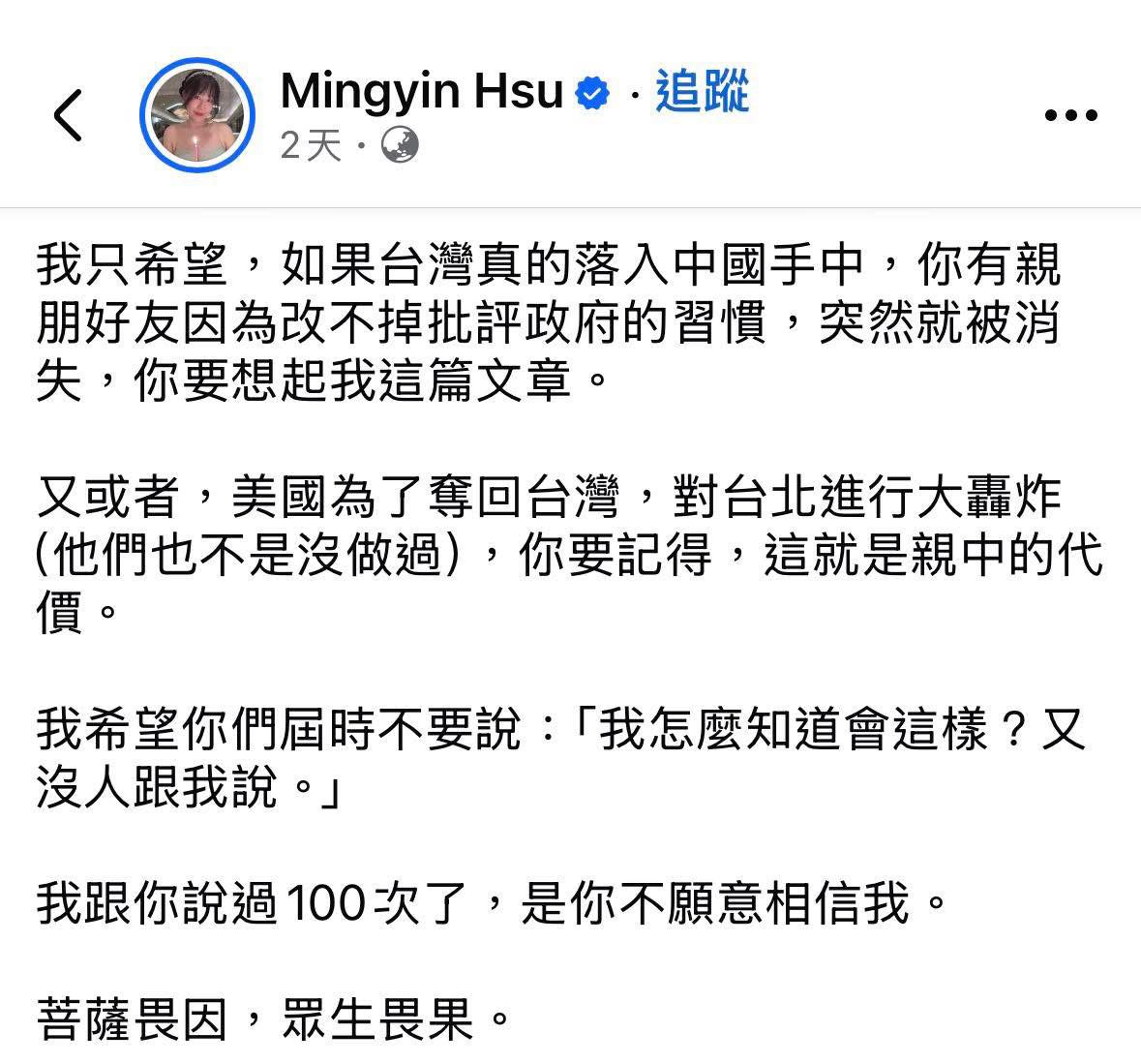 : 大意是:台灣女神徐閉表示,你們如果有親友改不掉批評政府的習慣,有一天台灣落入中