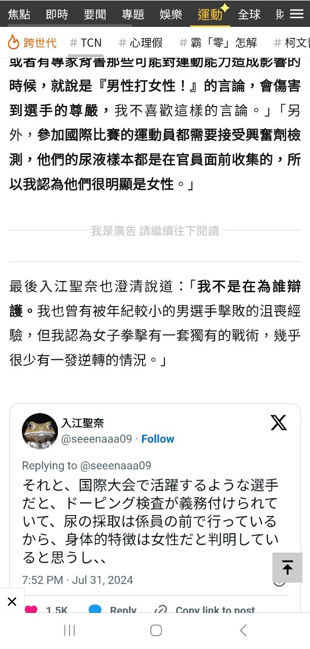 → mapulcatt: 她是男性基因有作用 所以睪固酮濃度特 116.241.252.70 02/09 23:17