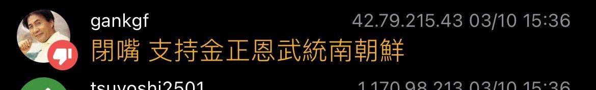 噓 gankgf: 閉嘴 支持金正恩武統南朝鮮 42.79.215.43 03/10 15:36