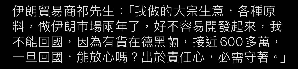 祁先生透露,他做外貿負債,到伊朗開拓市場,目前伊朗網路封鎖,全國斷網,他到邊境