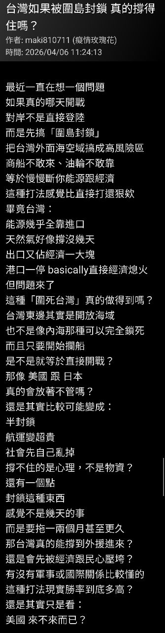 : 鄉民擔心台灣如果真的被老共封鎖
