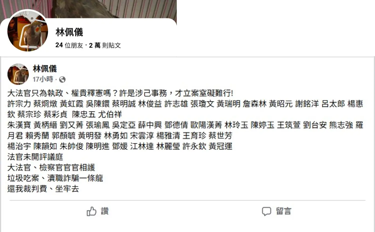 好猛喔 2萬則貼文 一半左右都是在罵法官 他的24個好友沒把他刪除 真是夠義氣 --