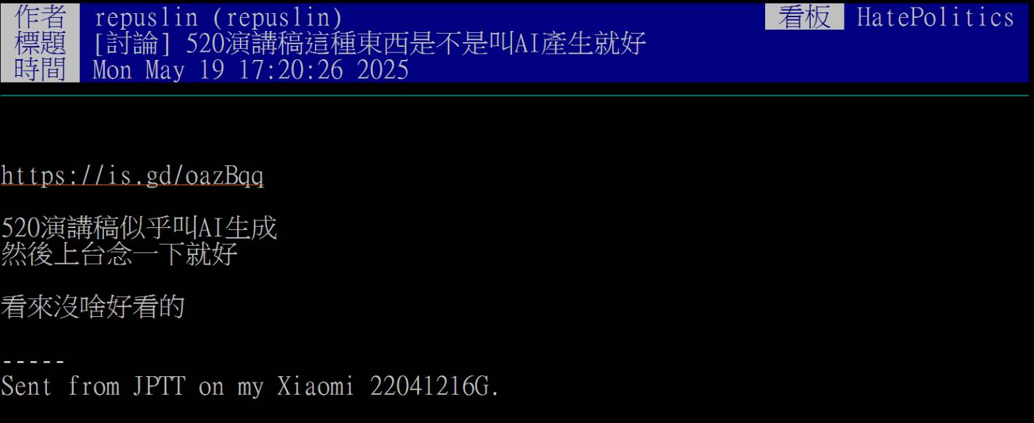 ※ 文章網址: https://www.ptt.cc/bbs/HatePolitics/M.1747727387.A.6C8.html
