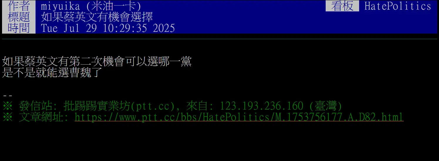 ※ 文章網址: https://www.ptt.cc/bbs/HatePolitics/M.1753756381.A.BF3.html