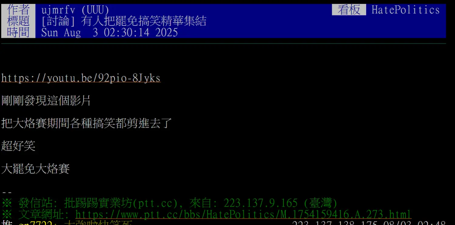 ※ 文章網址: https://www.ptt.cc/bbs/HatePolitics/M.1754183793.A.454.html