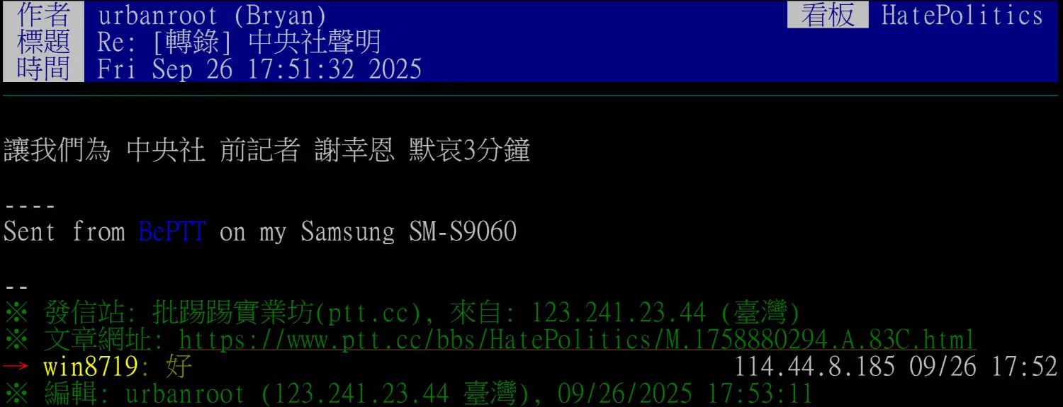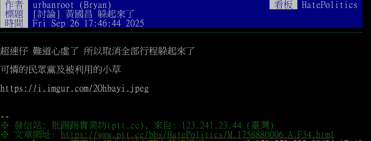 ※ 文章網址: https://www.ptt.cc/bbs/HatePolitics/M.1758881963.A.5D3.html