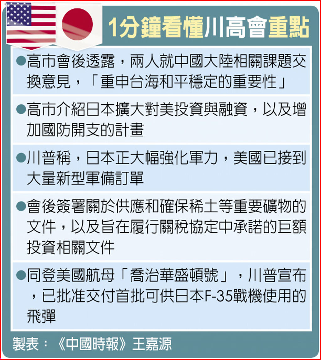 這是她首次與川普見面,加強美日同盟才是日本最優先的外交考量,所以「高市過去再怎