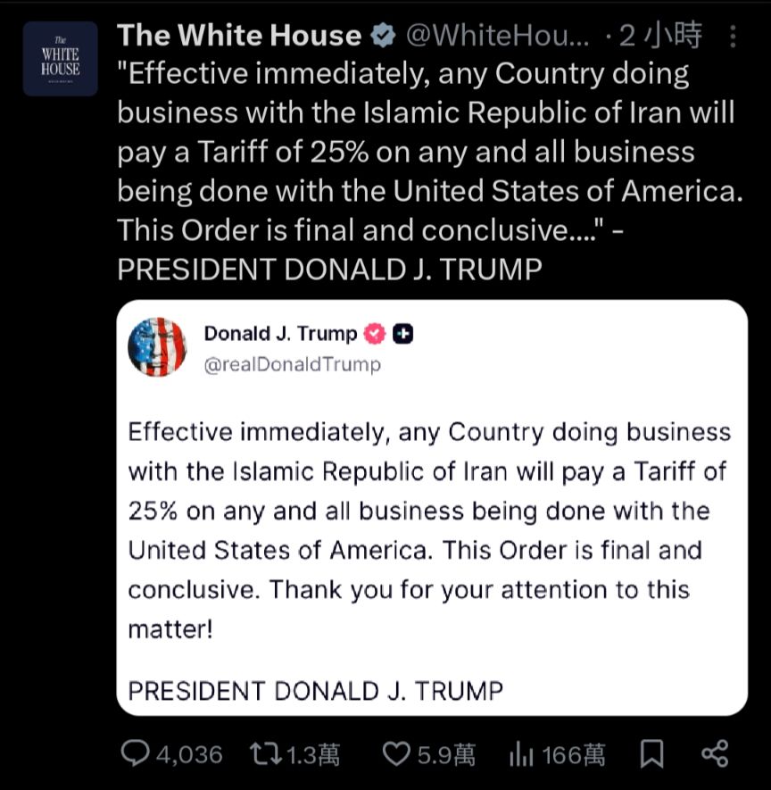 標題[黑特] 川普宣布跟伊朗貿易的國家要課25%關稅