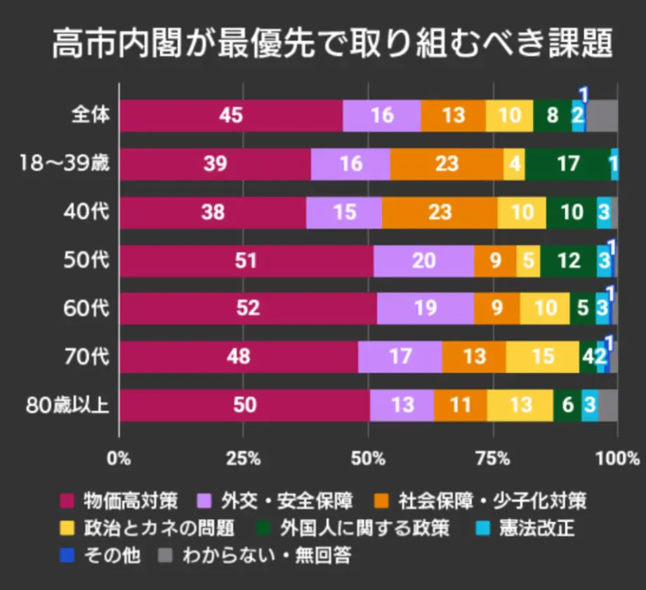 大部分人投下票時最重視的議題是物價高漲的對策,國防外交政策才是第二大的