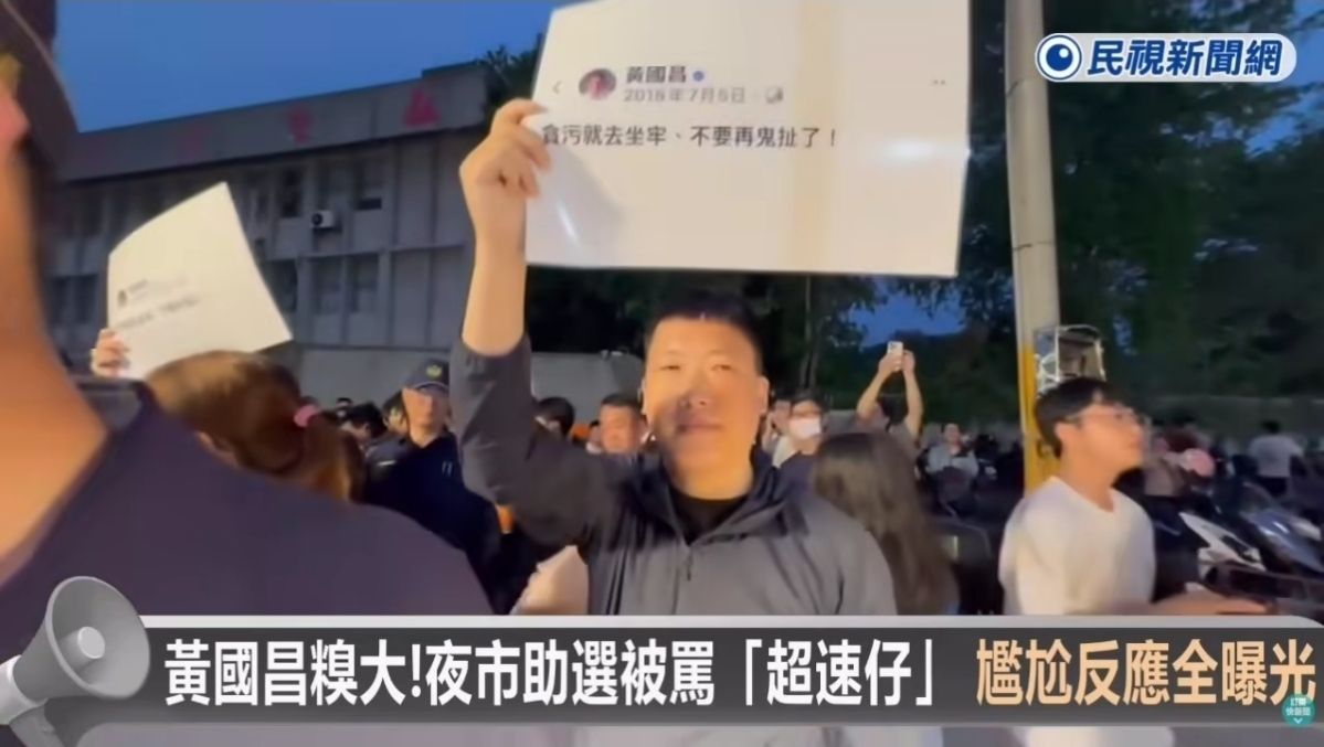台拜票。不過有抗議民眾,舉著黃國昌多年前「貪汙就去坐牢」的手板,當眾怒嗆他立場