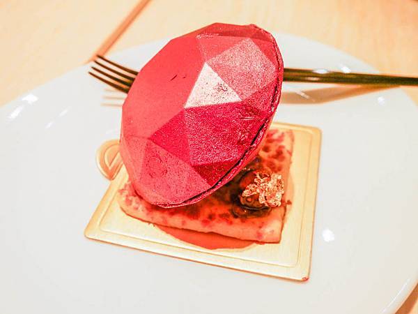華麗的鑽石造型很吸睛,隨附一片無味餅乾可解甜膩,另有顆外表以金箔包附的椹果。