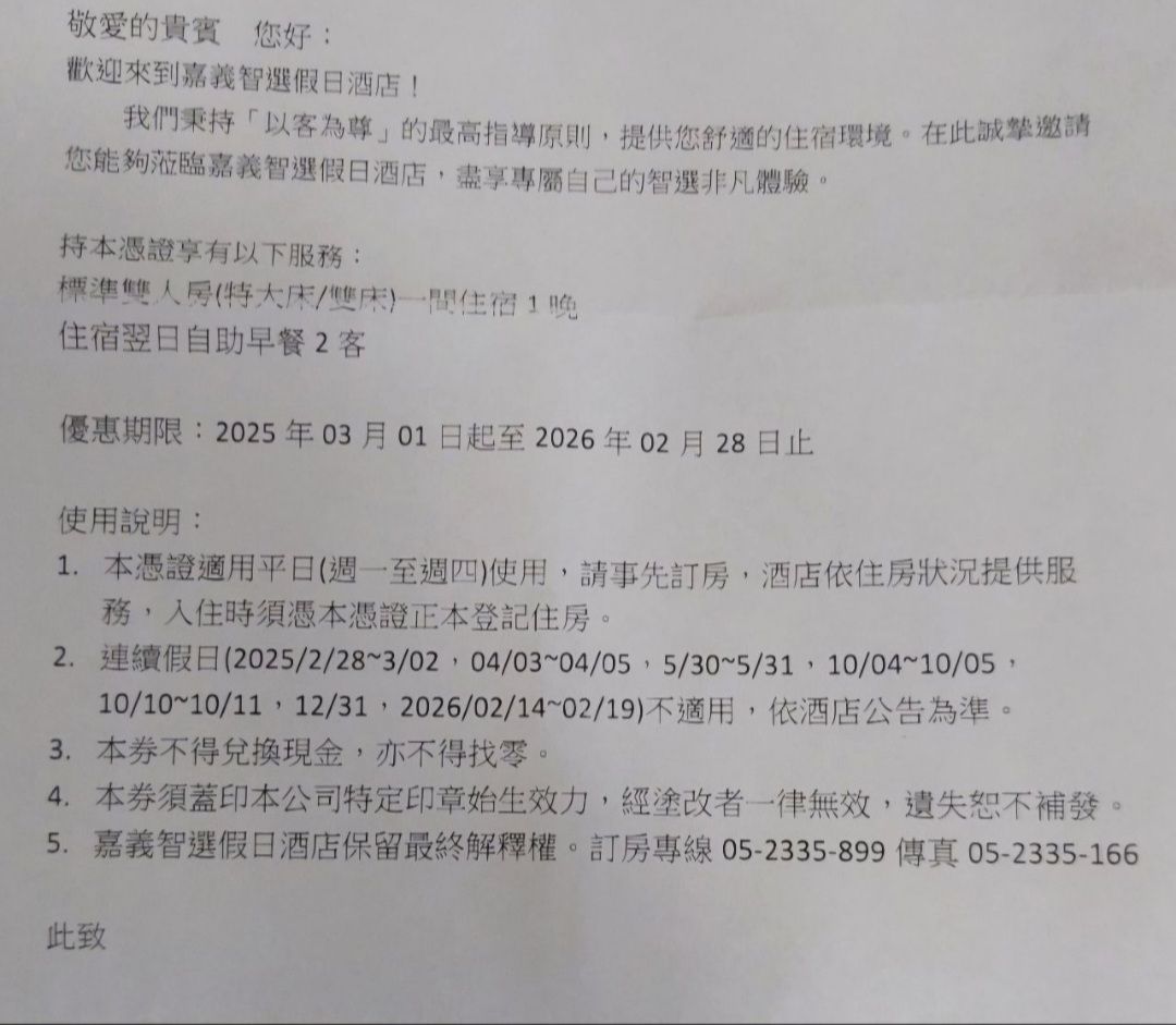 推 ppsun : [售]嘉義智選假日酒店平日住宿券2900元,效期規定如 01/05 12:05