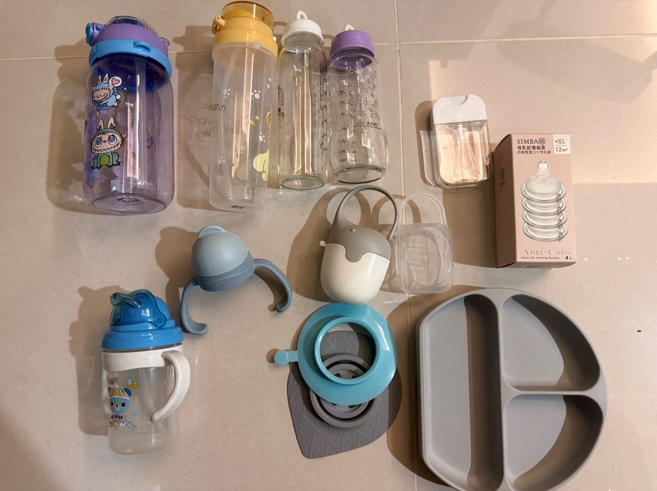2. 水壺(不確定會不會漏水)、玻璃儲乳瓶、奶嘴頭、奶嘴盒、矽膠盤、酒精瓶