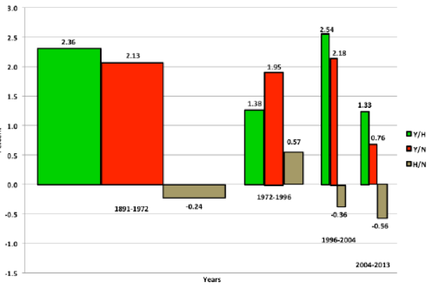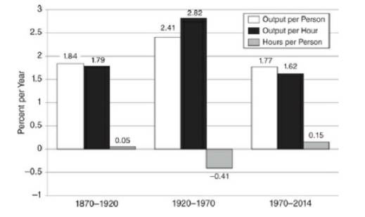 時產出的增長率平均為2.4%,但是在1972-1996年間人均小時產出僅增長1.4%,2004-2013