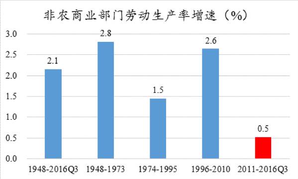 2011年以來,美國勞動生產率(單位時間產出)年均增長0.5%,遠低於1870-2010