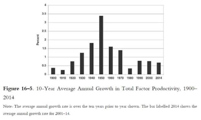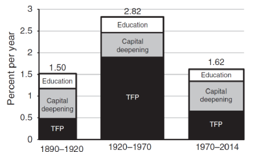 的一般用途發明已經發生了,很難再重現。因此,1920-1970年的全要素生產率(TFP)增