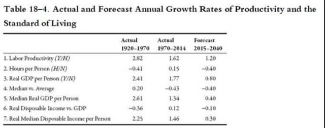 表1 實際及預測生產率和生活水平年度增長率。數據來源:Gordon (2016a)。