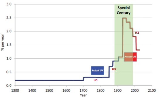 Gordon認為增長有時快有時慢,1870-1970年間因眾多重大發明的集中誕生,經濟增長和