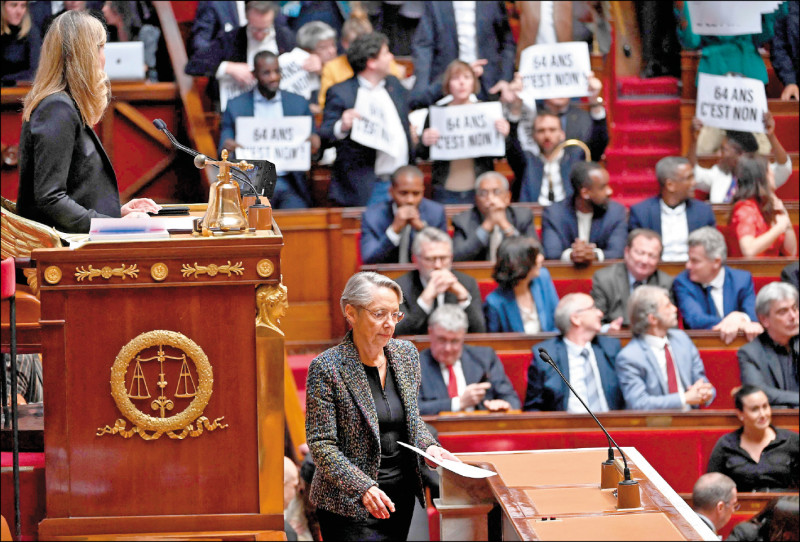 法國總理柏納16日下午抵達國民議會,無畏左翼議員舉牌抗議,不待國民議會表決退休